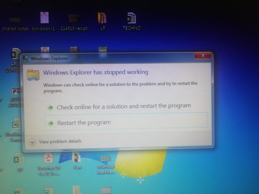 System Display the message ” windows Explorer has stopped working” as shown below